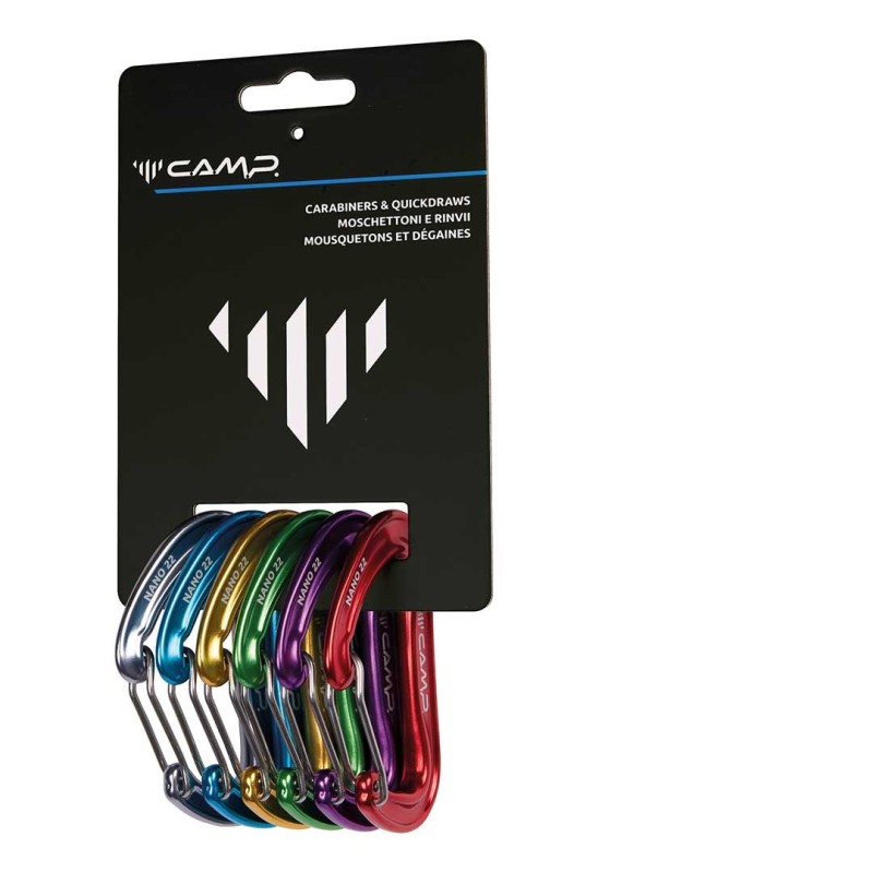 Pack di 6 moschettoni Nano 22 di colori diversi coordinati con quelli dei Cam più diffusi.
