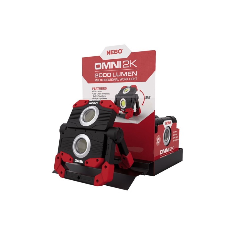 NEBO OMNI 2K ricaricabile 2000 Lumens Cob Led (C/DISPLAY) è una lampada da lavoro omnidirezionale che vanta una potente uscita Dual Cob da 2.000 Lumen con una funzione di segnalazione pericolo rossa.