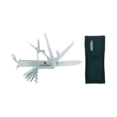 In acciaio inox, completo di custodia per il trasporto con asola per cintura • Coltello con lama da 6 cm • Pulisci unghie • Punteruolo • Cacciavite a croce • Punteruolo per funi • Cavatappi • Cacciavite piatto-apribottiglie • Sega • Leva scaglie • Forbici • Apriscatole