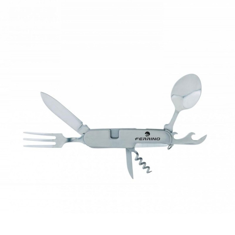 Coltello con lama da 6 cm in acciaio inox Completo di custodia per il trasporto con asola per cintura | Cavatappi | Punteruolo | Apribottiglie | Apriscatole | Cucchiaio | Forchetta.