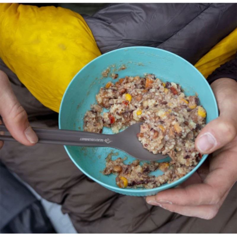 Il Frontier Spork è un cucchiaio/forchetta dotato di un manico resistente e comodo da impugnare e impilare insieme ad altri utensili Frontier per risparmiare spazio.