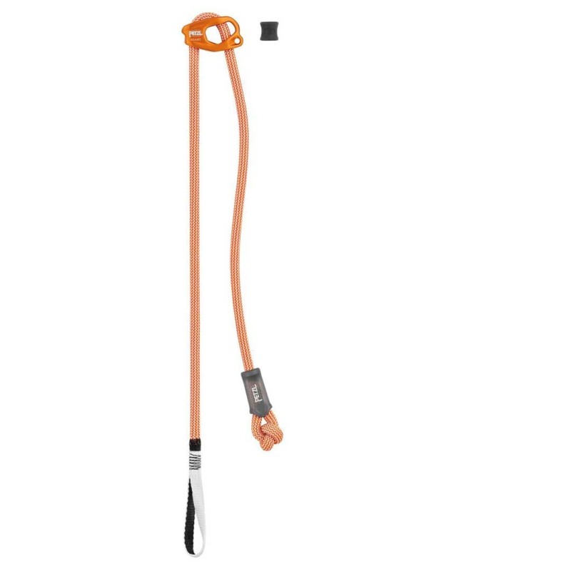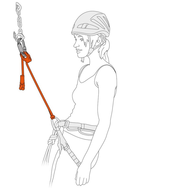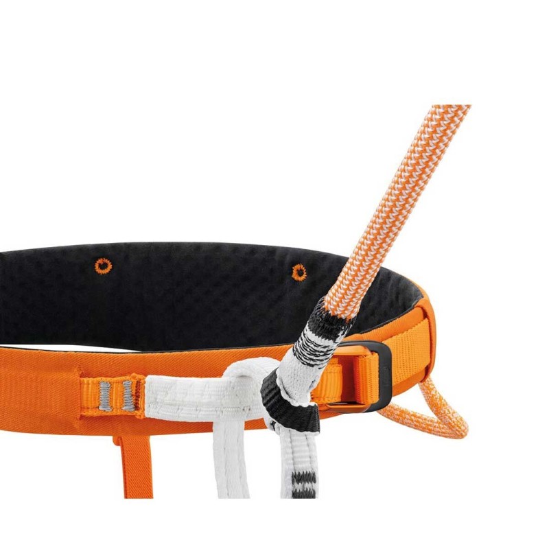- asola di collegamento in fettuccia polietilene ad alta densità (PEHD) cucita (brevetto Petzl) che consente d’installare il cordino sull’imbracatura mediante un nodo a bocca di lupo compatto, riducendo l’ingombro sull’anello d’assicurazione e garantendo una migliore visibilità nelle manovre alla sosta.
