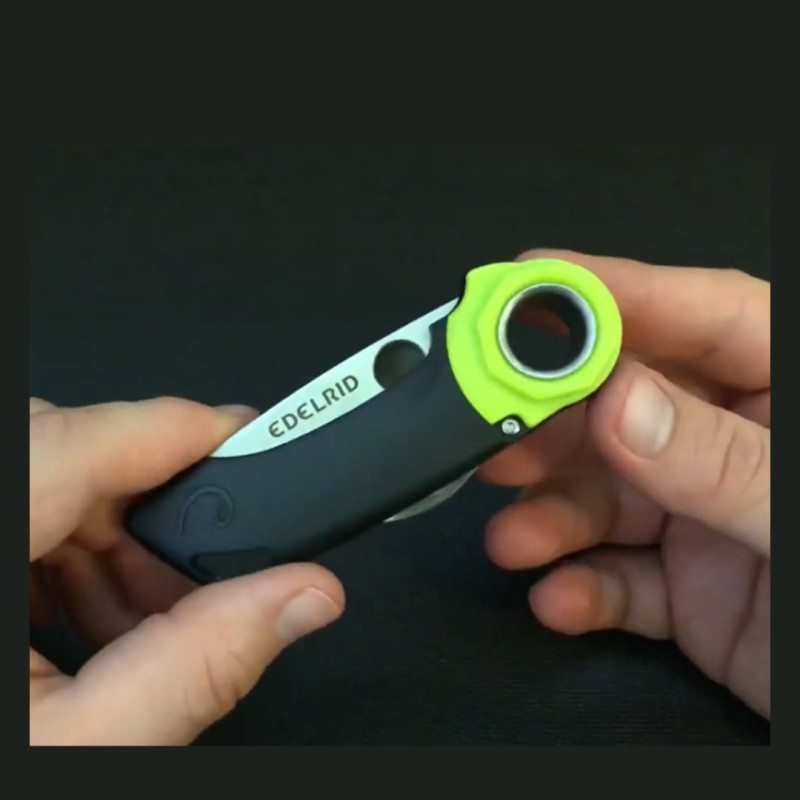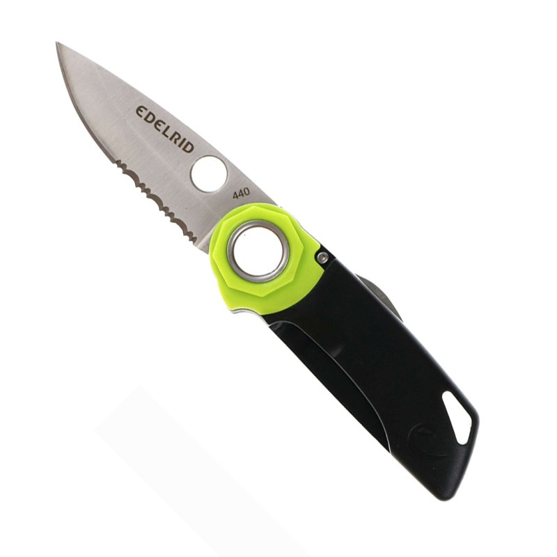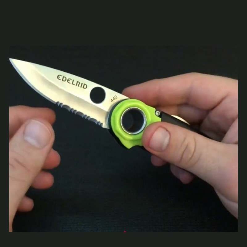 Edelrid Rope Tooth è un coltello per arrampicata e speleologia, a serramanico con lama in acciaio inossidabile. Fornito di un pratico foro può essere moschettonato ed appeso all'imbrago o a uno zaino. Peso: 48 g.